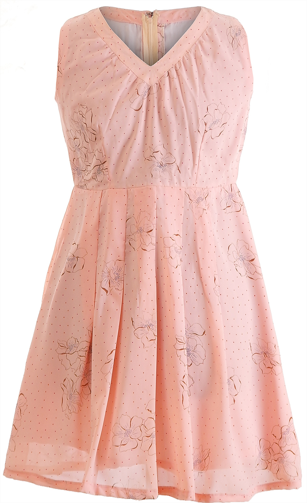 Платье без рукавов приталенного силуэта с V-образным вырезом. Легкий материал в сочетании с нежно-розовым цветом придают платью легкость и воздушность.